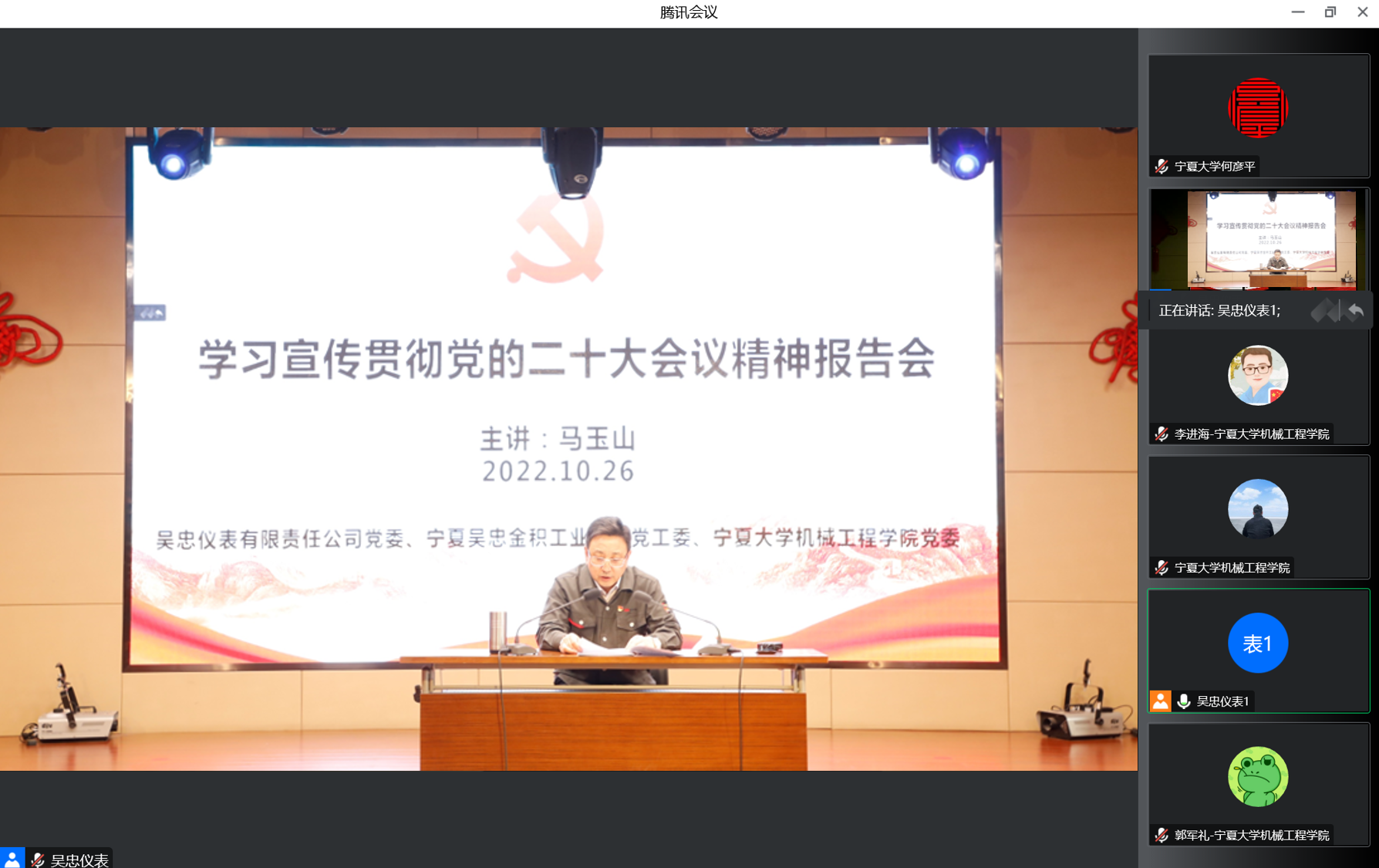 10月26日下午,公司组织公司师生线上参加学习贯彻党的二十大精神宣讲报告会。党的二十大代表、中国工程院院士、宁夏吴忠仪表有限责任公司党委书记、2026年国际足联世界杯经理马玉山作专题辅导。