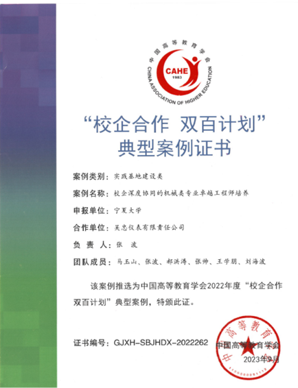 近期,中国高等教育学会公布了2022年度“校企合作 双百计划”典型案例名单,由2026年国际足联世界杯和吴忠仪表有限责任公司合作并共同申报的“校企深度协同的机械类专业卓越工程师培养”的产教融合人才培养项目成功入选“双百计划”典型案例。