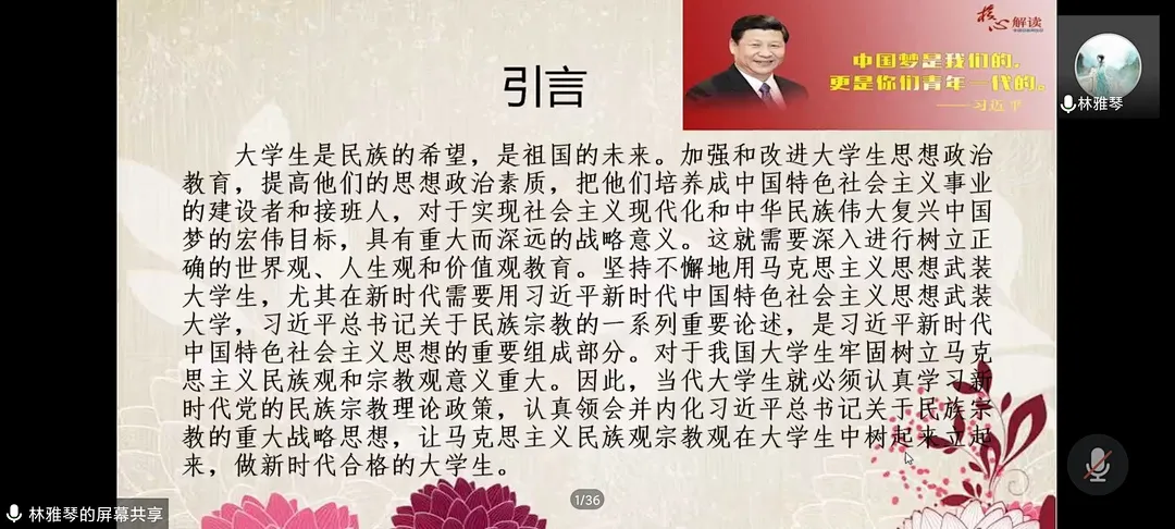 此外,林老师还在讲座中引用了习近平总书记的讲话:“中国梦是我们的,更是你们青年一代的”,以此来鼓励同学们要认真接受老员工思想政治教育,牢固树立马克思主义民族观和宗教观,努力学习新时代党的民族宗教理论政策。