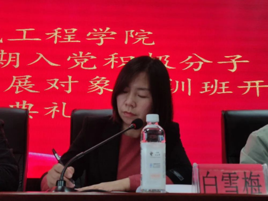 会议初始,白雪梅书记介绍了参加此次典礼的领导和老师,向大家讲解了后续党课的培训安排,公布了党课教学方式和考核办法,并要求各位学员要学好党的理论知识,树立远大的理想。党课学员代表杨婵发言,她说到:“此次学习机会来之不易,同学们应该珍惜此次党课培训机会,努力学习党的理论知识,争取早日成为一名合格的共产党员。”