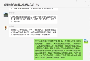 丁文捷、班伟、徐楠等多位老师表示坚决响应党中央号召,更加紧密地团结在以习近平同志为核心的党中央周围,埋头苦干、勇毅前行,不懈奋斗。坚决拥护中国共产党的领导,牢记党员的历史使命,艰苦奋斗,吃苦在先,享乐在后,为实现第二个百年奋斗目标持续努力。李瑞、刘坤老师表示要始终鼓起“闯”的勇气、激发“拼”的劲头、保持“实”的干劲,更加自觉地用习近平新时代中国特色社会主义思想武装头脑、指导实践、推动工作。