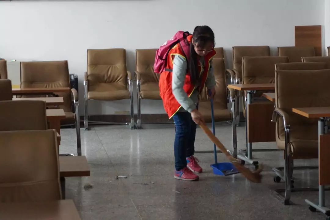 志愿者们井然有序的划分负责区域,开始在自己的卫生区域开始打扫卫生。同学们或是用扫帚扫地上的垃圾或灰尘,或是用手捡起来较大的垃圾丢入垃圾桶,或是拿着抹布抹着门窗,拿着拖把拖着地。一个同学拿着扫帚,另一个就用工具装垃圾,同学们都在互帮互助中感受集体的力量。在团结中同学们认真清扫,良好的精神风貌为凉爽的天气增添了一份温暖。没过多久,整栋楼焕然一新,清扫活动在洁净的整栋楼中结束。虽然同学们满头大汗,但从他们嘴上的笑容可以看出他们过了一个充实的下午。