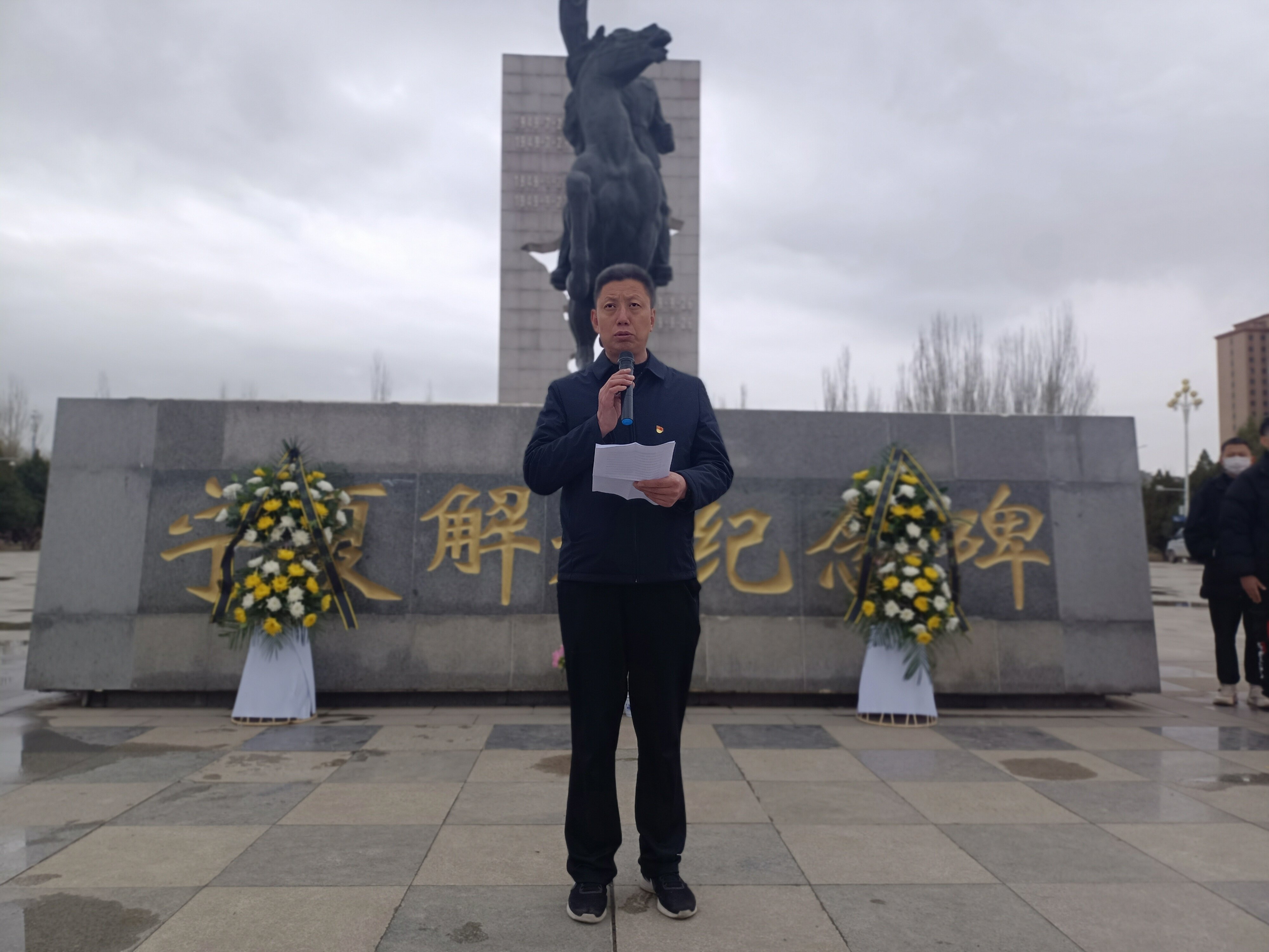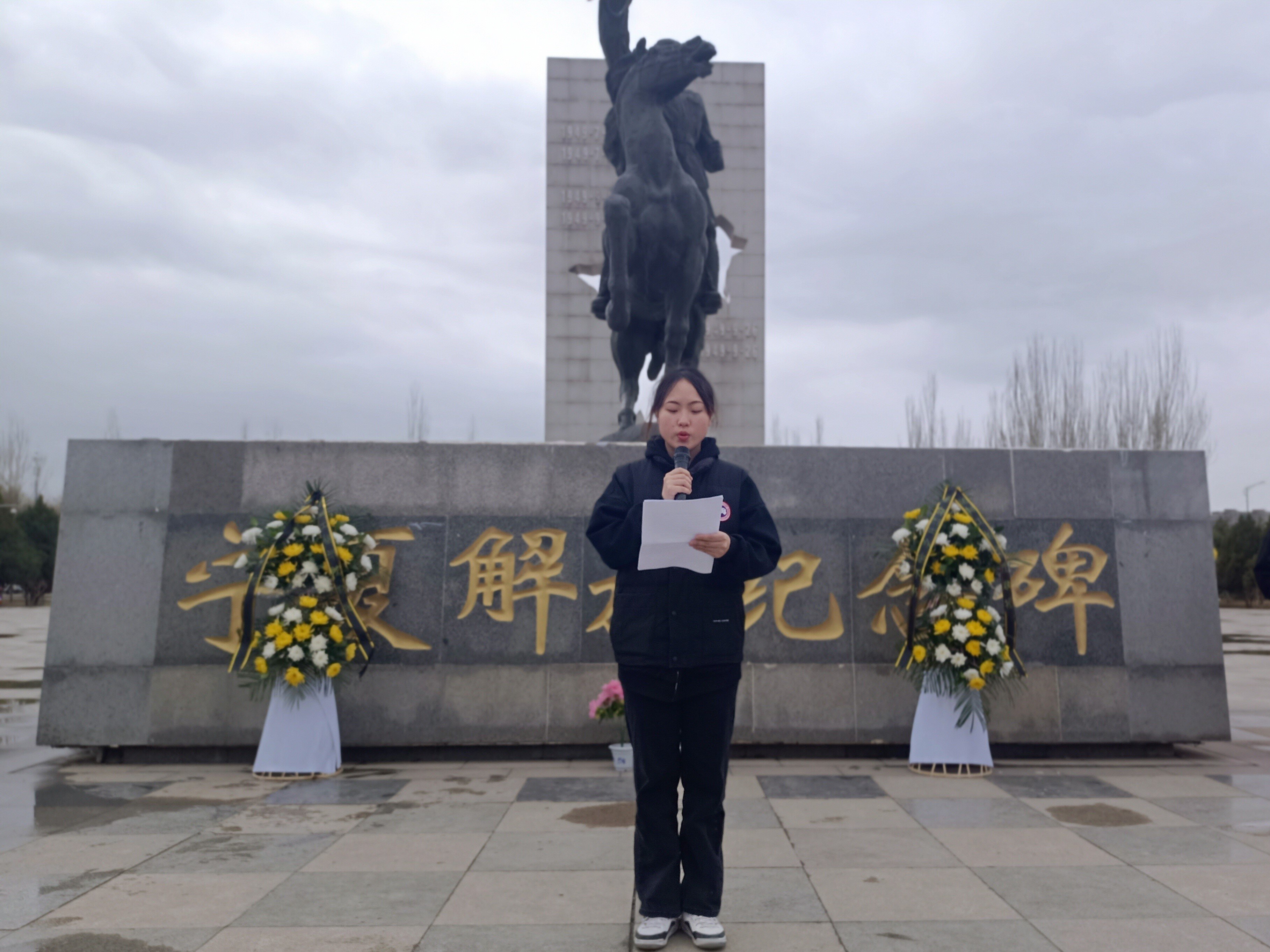 上午九时,解放纪念碑前,全体师生整齐列队肃立,八名员工代表迈着坚定有力的礼步,护送花篮缓慢走到纪念碑敬,向革命烈士献花,何彦平上前整理挽联。在场师生肃立默哀一齐寄托对革命先烈的哀思,表达了对革命先烈的深情缅怀和崇高敬意。