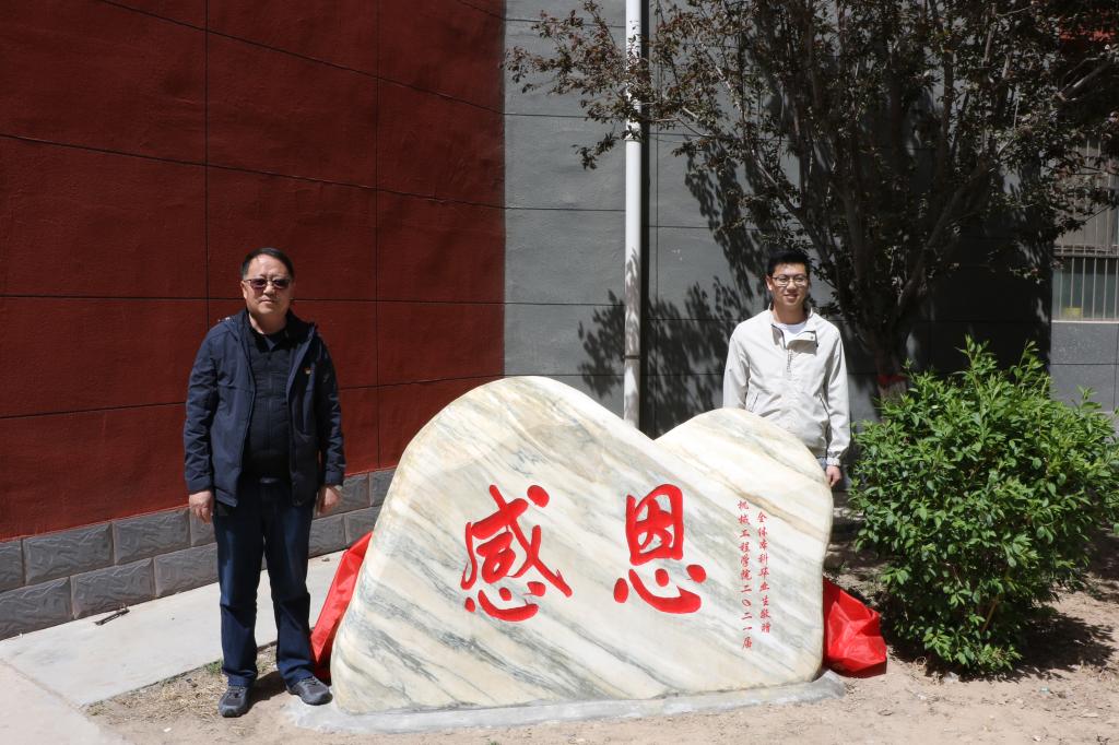 钟子杰和2021届毕业生毛宁为“感恩石”揭幕,并由张波为2021届毕业生送祝福。张波讲到,这块“感恩石”不仅是一份礼物,更是2021届毕业生留给公司永恒的回忆。他表示,公司会始终以大家为荣,也希望所有人以公司为家,不断锤炼自身本领,承担起自己的历史使命与社会责任,用实际行动回报母校、回报社会。