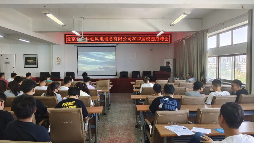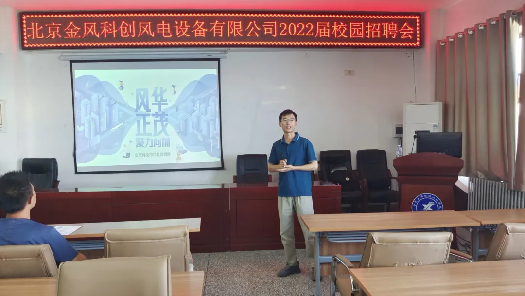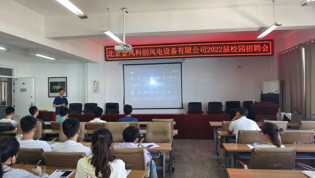 9月23日,北京金风科创风电设备有限公司在明远楼512室举行2022届校园招聘会,此次招聘会面向2022届毕业生以及其他有意愿的员工,同学们积极响应,共70余人到场。