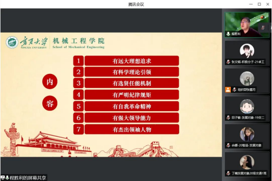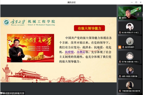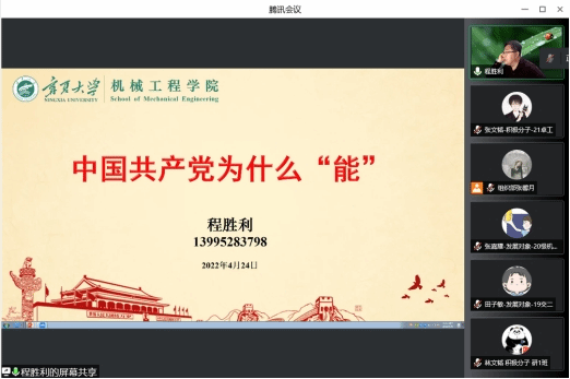 党课开始,程胜利就同学们前几次党课的学习、对党的认识以及中国共产党为什么“能”与同学们进行了探讨交流。接着,程书记将理论与具体事例相结合,围绕中国共产党有“远大理想追求、科学理论引领、选贤任能机制、严明纪律规矩、自我革命精神、强大领导能力”等一系列优秀特质展开本次培训。
