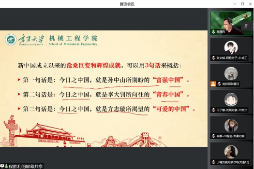 他强调,今日之中国,是革命先辈所期盼的“富强中国”、“青春中国”、“可爱中国”。身居当下之中国,我们要感悟党的初心和使命,坚持中国共产党领导、理解马克思主义这一立党立国的根本指导思想、理解党全心全意为人民服务的根本宗旨。