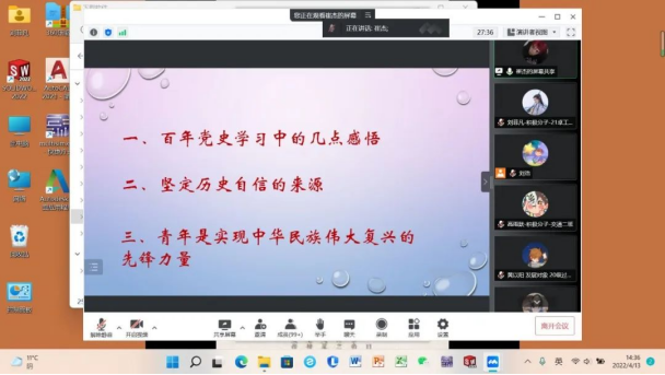 党课开始,崔杰老师从百年党史的主题主线,学史明理的历史逻辑、理论逻辑与实践逻辑,中国共产党重视党史学习教育的经验启示,跟随习近平总书记的足迹学习党史四个方面为同学们分享了百年党史学习教育中的感悟。