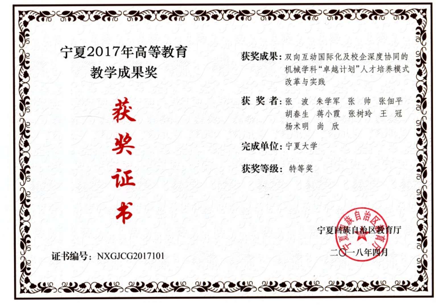 1. 2017年:双向互动国际化及校企深度协同的机械学科“卓越计划”人才培养模式改革与实践(特等奖)